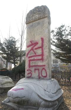 史跡第101号に指定されている「三田渡碑」(ソウル市松坡区石村洞)にスプレーがかけられた。三田渡碑は丙子の乱(1636年に起きた清による第2回朝鮮侵略)の際、朝鮮が清に敗れた後、清の太宗の要求により彼を称える言葉を刻んだ石碑で、「大清皇帝功徳碑」と書かれている。この高さ3.95メートル、幅1.4メートルの石碑の前面と裏面に1メートルほどの大きさで「撤」「去」という文字が赤のスプレーで書かれているのが発見された。